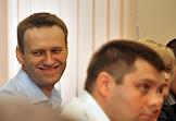 Председатель Координационного совета оппозиции (КСО) Алексей Навальный (в центре), обвиняемый в растрате имущества "Кировлеса", во время судебного слушания по его делу в Ленинском районном суде города Кирова.