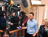 Председатель Координационного совета оппозиции (КСО) Алексей Навальный (в центре), обвиняемый в растрате имущества "Кировлеса", после судебного слушания по его делу в Ленинском районном суде города Кирова.