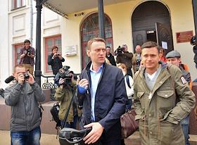 Председатель Координационного совета оппозиции (КСО) Алексей Навальный (в центре), обвиняемый в растрате имущества "Кировлеса", и член бюро движения "Солидарность" Илья Яшин (второй справа) после судебного слушания по делу Навального в Ленинском районном суде города Кирова.
