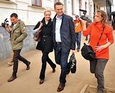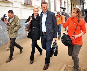 Председатель Координационного совета оппозиции (КСО) Алексей Навальный (в центре), обвиняемый в растрате имущества "Кировлеса", с супругой Юлией (слева) после судебного слушания по его делу в Ленинском районном суде города Кирова.