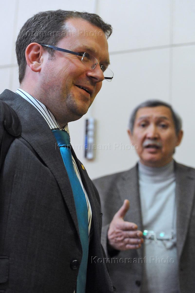 Начальник департамента QS Intelligence Unit Бен Совтер (Лондон, Великобритания) (слева) и заведующий кафедрой истории философии факультета гуманитарных и социальных наук РУДН, специалист по арабо-мусульманской философии Нур Кирабаев (справа) на совещании ректоров московских вузов в Российском университете дружбы народов (РУДН) имени П.Лумумбы.