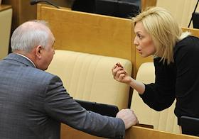 Член комитета Государственной думы России по информационной политике, информационным технологиям и связи Ольга Тимофеева (слева) и член Комитета Государственной Думы России по транспорту Олег Нилов (справа) во время заседания Госдумы.