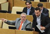 Лидер Либерально-демократической партии России (ЛДПР), член комитета Государственной думы (ГД) России по обороне Владимир Жириновский (слева) и член комитета ГД по физической культуре, спорту и делам молодежи Дмитрий Носов (справа) во время заседания Госдумы.