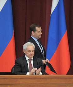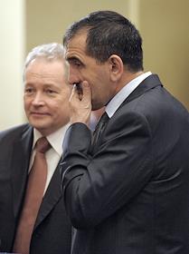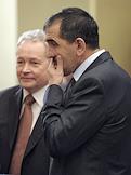 Губернатор Пермского края Виктор Басаргин (слева) и президент Республики Ингушетия Юнус-Бек Евкуров (справа) перед началмо расширенного заседания коллегии министерства экономического развития России "Об итогах деятельности Министерства в 2012 году и задачах на 2013 год".