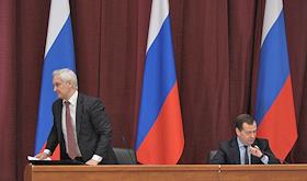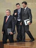 Заместитель председателя правительства России Дмитрий Рогозин (слева) и министр России по связям с Открытым правительством Михаил Абызов (справа) во время расширенного заседания коллегии министерства экономического развития России "Об итогах деятельности Министерства в 2012 году и задачах на 2013 год".