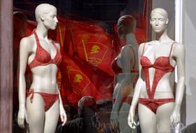 Первомайская демонстрация на Невском проспекте. Отражение красных флагов в витрине магазина женского белья.