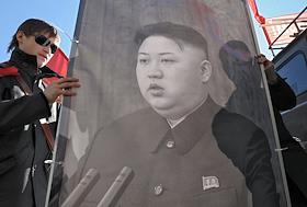 Участники Первомайской демонстрации на Невском проспекте. Портрет лидера КНДР Ким Чен Ына.