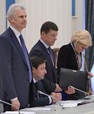 Совещание о ходе выполнения указов президента России, подписанных в день вступления в должность главы государства 7 мая 2012 года. Слева направо: помощник президента России Андрей Фурсенко, заместитель председателя правительства, полномочный представитель президента России в Северо-Кавказском федеральном округе Александр Хлопонин, заместители председателя правительства России Дмитрий Козак и Ольга Голодец на совещании в Кремле.