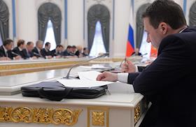 Совещание о ходе выполнения указов президента России, подписанных в день вступления в должность главы государства 7 мая 2012 года. Совещание прошло в Кремле.