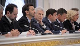 Совещание о ходе выполнения указов президента России, подписанных в день вступления в должность главы государства 7 мая 2012 года. Слева направо: министр внутренних дел России Владимир Колокольцев, министр природных ресурсов и экологии России Сергей Донской, министр России по связям с Открытым правительством Михаил Абызов, помощник президента России Андрей Фурсенко, заместитель председателя правительства, полномочный представитель президента России в Северо-Кавказском федеральном округе Александр Хлопонин, заместители председателя правительства России Дмитрий Козак и Ольга Голодец на совещании в Кремле.