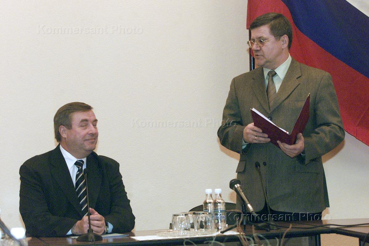 Министр юстиции Юрий Чайка (справа) вручил председателю Государственной Думы России Геннадию Селезневу (слева) свидетельство о регистрации возглавляемой им Партии возрождения России (ПВР). Церемония вручения состоялась в Министерстве юстиции России.