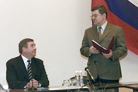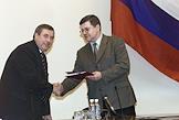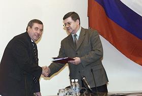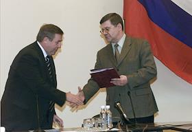 Russian Justice Minister Yury Chayka (right) delivers the Party of Russian Renaissance (PVR) registration certificate to the party leader - State Duma Speaker Gennady Seleznev (left). The event took place in the Justice Ministry headquarters.