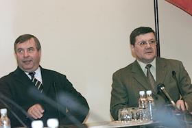 Speraker of the State Duma Gennady Seleznev (left) arrives at the Justice Ministry headquarters to get the registration certificate of the Russian Renaissance Party (PVR) (founded and headed by himself).