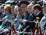 Парад на Красной площади, посвященный 68-й годовщине Победы в Великой Отечественной войне 1941-45 годов. Президент Российской академии военных наук, доктор военных наук, профессор Махмут Гареев (третий слева), министр обороны России Сергей Шойгу (в центре), президент России Владимир Путин (четвертый справа) и председатель правительства России Дмитрий Медведев (третий справа) во время парада.