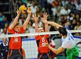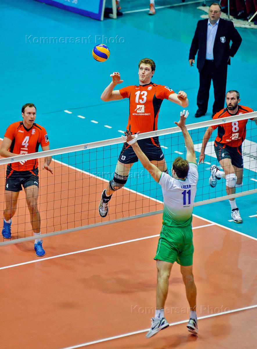 Чемпионат России по волейболу среди мужских команд. Финальная серия. Матч между командами "Белогорье" - "Урал". Слева направо: волейболисты Дмитрий Мусэрский, Андрей Ащев и Леандро Виссотто во время матча.