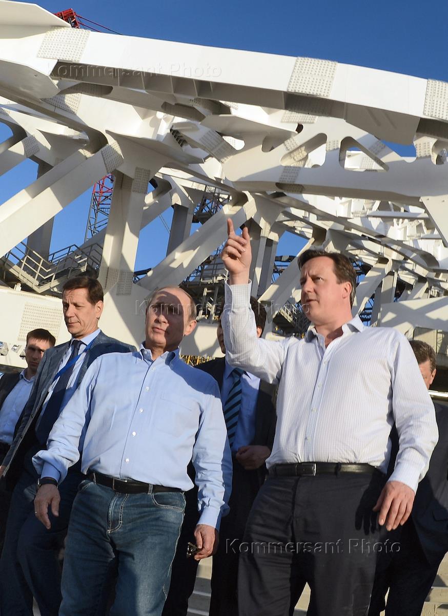 Премьер-министр Великобритании Дэвид Кэмерон (слева) и президент России Владимир Путин (справа) во время посещения центрального олимпийского стадиона "Фишт", который проектировался и строится с участием британских компаний.