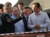 Президент России Владимир Путин (второй слева), заместитель председателя правительства России Дмитрий Козак (второй справа) и премьер-министр Великобритании Дэвид Кэмерон (справа) во время посещения центрального олимпийского стадиона "Фишт", который проектировался и строится с участием британских компаний.