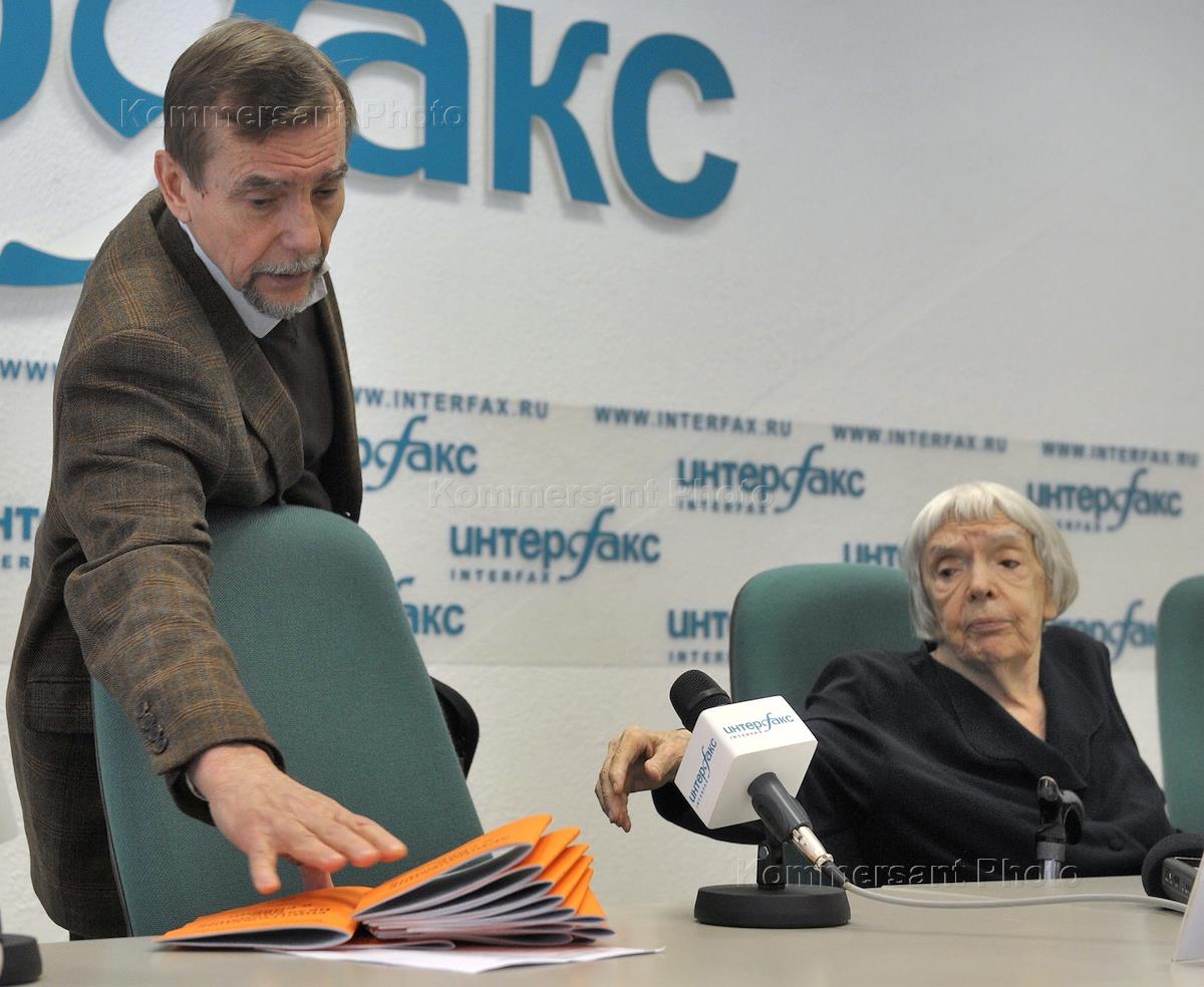 Председатель Московской Хельсинкской группы Людмила Алексеева (слева) и исполнительный директор движения "За права человека" Лев Пономарев (справа) во время пресс-конференции на тему "Что будет с российским гражданским обществом после прокурорских проверок НКО?". Пресс-конференция прошла в центральном офисе агентства "Интерфакс".