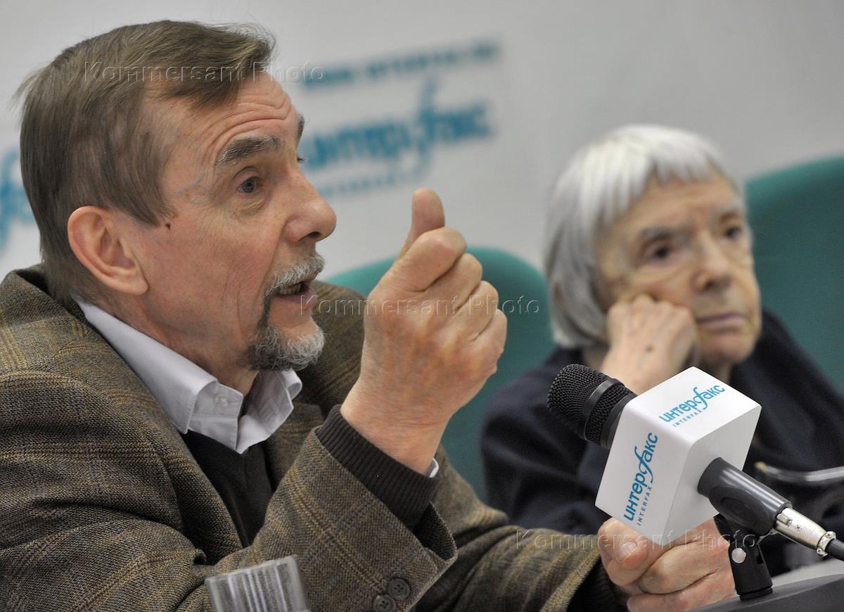 Исполнительный директор движения "За права человека" Лев Пономарев (слева) и председатель Московской Хельсинкской группы Людмила Алексеева(справа) во время пресс-конференции на тему "Что будет с российским гражданским обществом после прокурорских проверок НКО?". Пресс-конференция прошла в центральном офисе агентства "Интерфакс".