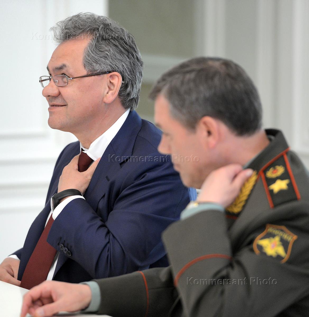 Министр обороны России Сергей Шойгу (слева) и первый заместитель министра обороны России Валерий Герасимов (справа) во время совещания с руководством Министерства обороны и аппарата Совета Безопасности об итогах внеплановых военных учений, состоявшихся 28–29 марта в Краснодарском крае.