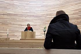 В Часовне тишины Камппи на площади Narinkkatori. Проектировщики - архитекторы Киммо Линтула, Нико Сирула, Микко Сумманен. Строительство часовни - часть программы World Design Capital Helsinki 2012.