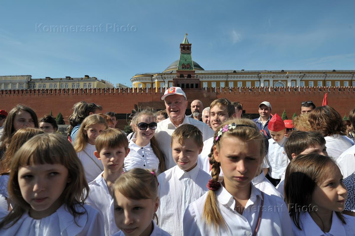 Лидер Коммунистической партии России (КПРФ) Геннадий Зюганов (в центре) на торжественной церемонии приема детей в пионеры. Церемония прошла на Красной площади.
