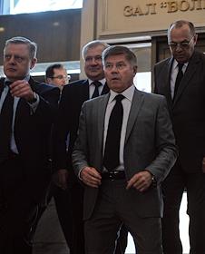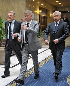 Слева направо: генеральный директор Судебного Департамента Верховного Суда России Александр Гусев, председатель Совета судей России Дмитрий Краснов и председатель Верховного суда России Вячеслав Лебедев после пленарного заседания Совета судей России. Заседание прошло в "Президент-отеле".