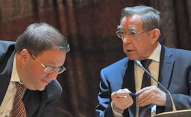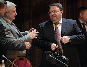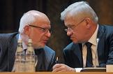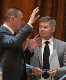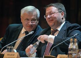 Председатель Высшего Арбитражного суда России Антон Иванов (слева) и советник президента России, представитель президента России в Высшей квалификационной коллегии судей России Вениамин Яковлев (справа) во время пленарного заседания Совета судей России. Заседание прошло в "Президент-отеле".
