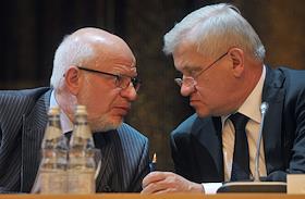 Председатель Совета при президенте России по развитию гражданского общества и правам человека Михаил Федотов (слева) и председатель Совета судей России Дмитрий Краснов (справа) во время пленарного заседания Совета судей России. Заседание прошло в "Президент-отеле".