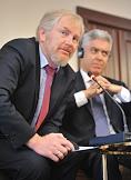 Конференция Ассоциации европейского бизнеса (АЕБ) "Россия; какой быть стратегии в меняющемся мире". Заместитель министра финансов России Сергей Сторчак (слева) и член Общественной палаты России, член Совета при Президенте России по содействию развитию институтов гражданского общества и правам человека Игорь Юргенс (справа) во время конференции в гостинице "Марриотт Гранд Отель".