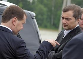 Председатель Правительства России Дмитрий Медведев (слева) и член попечительского совета Фонда "Сколково" Владислав Сурков (справа) во время международной конференции для стартапов и инвесторов "Startup Village" в Сколково.