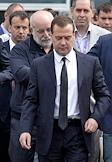 Слева направо: заместитель председателя Правительства России Аркадий Дворкович, президент фонда "Сколково", председатель совета директоров группы компаний "Ренова" Виктор Вексельберг, председатель правительства России Дмитрий Медведев перед началом международной конференции для стартапов и инвесторов "Startup Village" в Сколково.