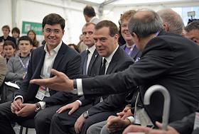 Исполнительный директор кластера энергоэффективных технологий фонда "Сколково" Василий Белов (слева) и председатель правительства России Дмитрий Медведев (справа второй) во время международной конференции для стартапов и инвесторов "Startup Village" в Сколково.