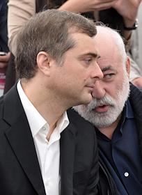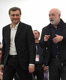 Член попечительского совета Фонда "Сколково" Владислав Сурков (слева) и президент фонда "Сколково", председатель совета директоров группы компаний "Ренова" Виктор Вексельберг (справа) во время международной конференции для стартапов и инвесторов "Startup Village" в Сколково.