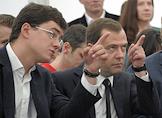 Председатель правительства России Дмитрий Медведев(в центре) и заместитель председателя Правительства России Аркадий Дворкович (справа) перед началом международной конференции для стартапов и инвесторов "Startup Village" в Сколково.