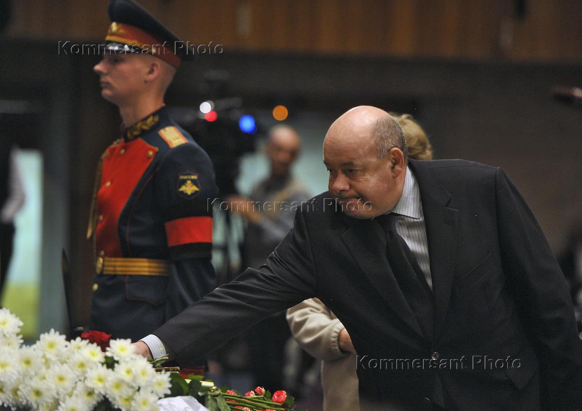 Специальный представитель Президента России по международному культурному сотрудничеству Михаил Швыдкой (справа) во время гражданской панихиды по режиссеру Петру Тодоровскому в большом зале Центрального дома кино.
