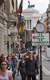 Виды Рима. Надписи на русском языке в витрине магазина "Можно платить в рублях", "Распродажа".