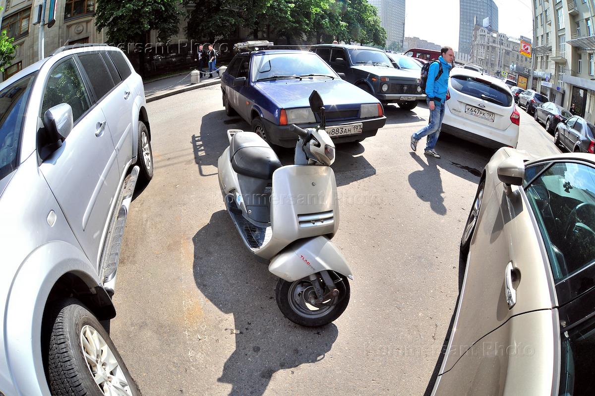 Жанровая фотография. Автомобиль и мотоцикл на улице города.