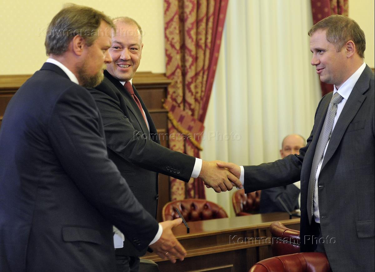 Встреча мэра Москвы Сергея Собянина с представителями строительных компаний-инвесторов. Основатель, основной владелец и президент ГК "Мортон" Александр Ручьев (слева), президент-председатель правления ОАО "Банк Москвы" Михаил Кузовлев (вверху), представитель от законодательного (представительного) органа государственной власти Ленинградской области Андрей Молчанов (в центре) во время встречи в мэрии.