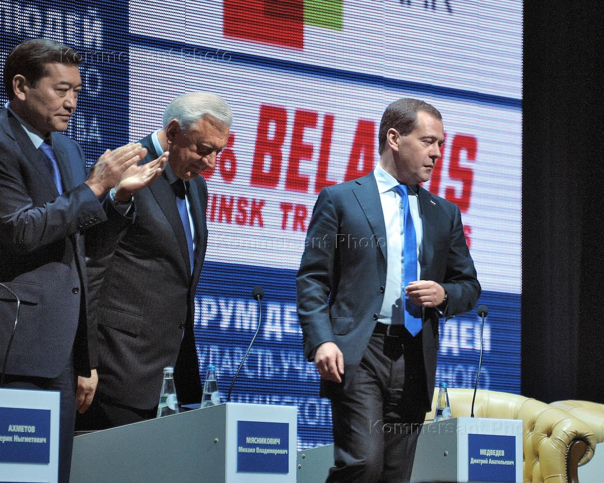 Пленарное заседание Форума деловых людей стран Единого экономического пространства. Слева направо: премьер-министр Казахстана Серик Ахметов, премьер-министр Белоруссии Михаил Мясникович и председатель правительства России Дмитрий Медведев во время заседания.