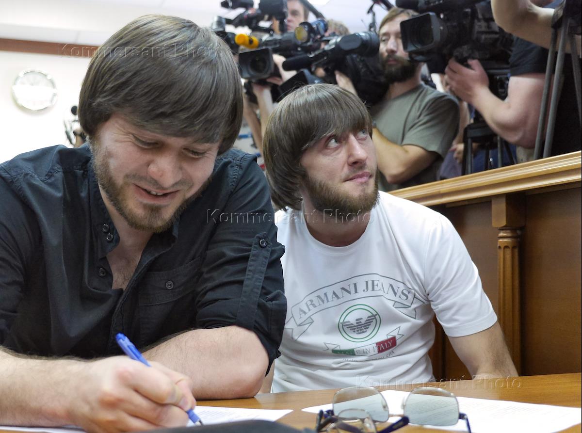 Подозреваемые в убийстве журналистки "Новой газеты" Анны Политковской слева направо: братья Джабраил и Ибрагим Махмудовы во время первого заседание в рамках судебного процесса в Мосгорсуде.