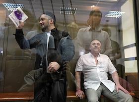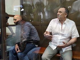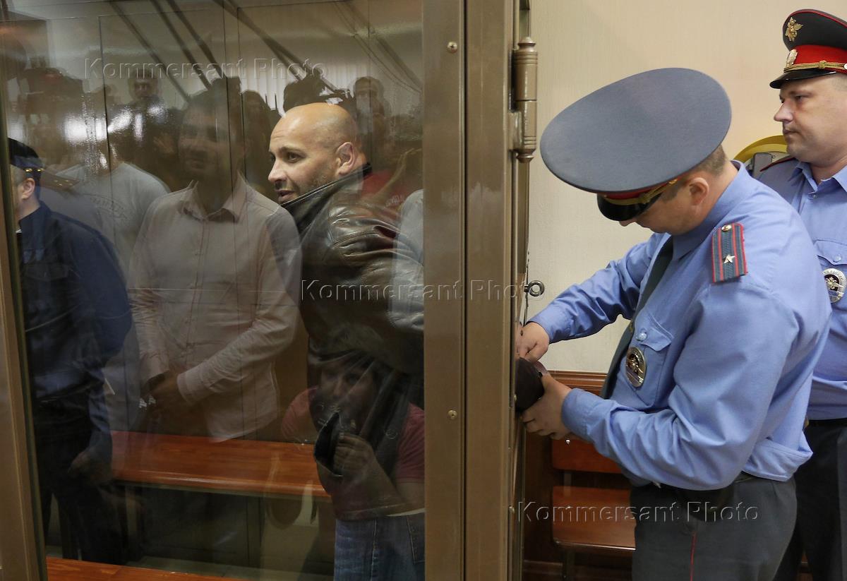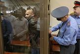 Обвиняемые в убийстве журналистки "Новой газеты" Анны Политковской Рустам Махмудов (слева) и Лом-Али Гайтукаев (справа) во время первого заседание в рамках судебного процесса в Мосгорсуде.