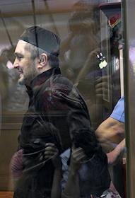 Обвиняемые в убийстве журналистки "Новой газеты" Анны Политковской Лом-Али Гайтукаев во время первого заседание в рамках судебного процесса в Мосгорсуде.