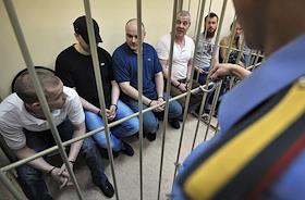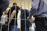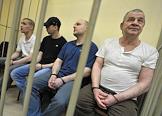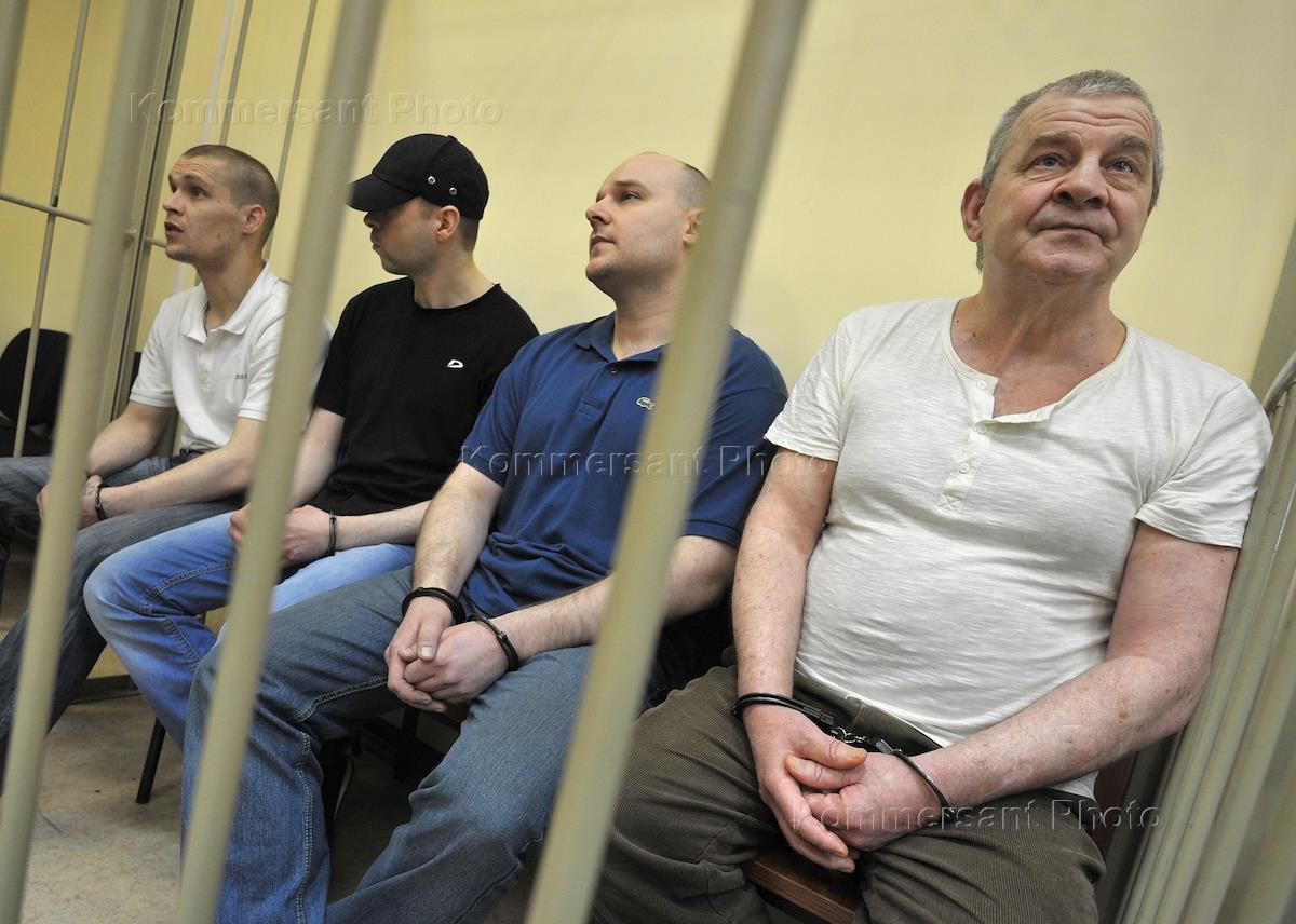 Обвиняемые по делу о похищении сына генерального директора ЗАО "Лаборатория Касперского" Евгения Касперского слева направо: Семен Громов, Олег Маюков, Николай Савельев (младший) и Николай Савельев во время заседания в Хорошевском суде города Москвы.