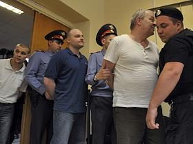 Обвиняемые по делу о похищении сына генерального директора ЗАО "Лаборатория Касперского" Евгения Касперского слева направо: Семен Громов, Олег Маюков и Николай Савельев (младший) во время заседания в Хорошевском суде города Москвы.