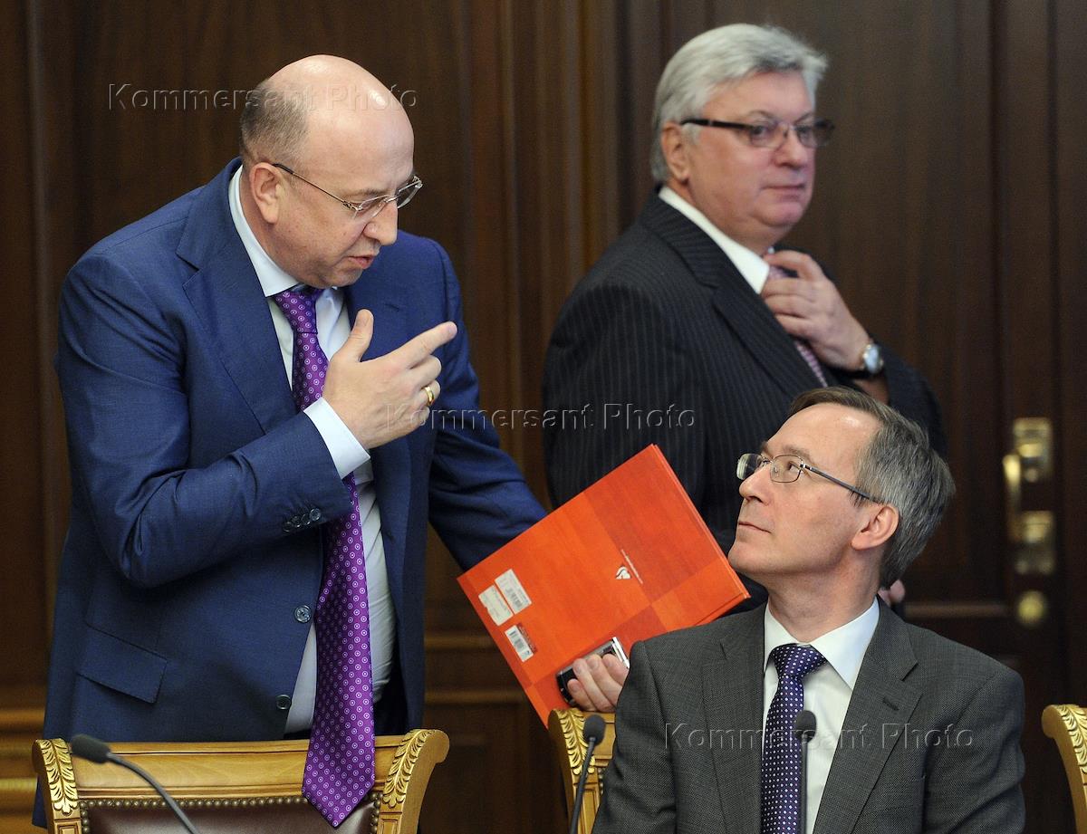 Председатель комитета Государственной думы (ГД) России по конституционному законодательству и государственному строительству Владимир Плигин (слева) и ректор МГИМО Анатолий Торкунов (в центре) на заседании Экспертного совета на тему: "Об отдельных вопросах и развитии координационного совета". Заседание прошло в Ореховом зале ГД России.
