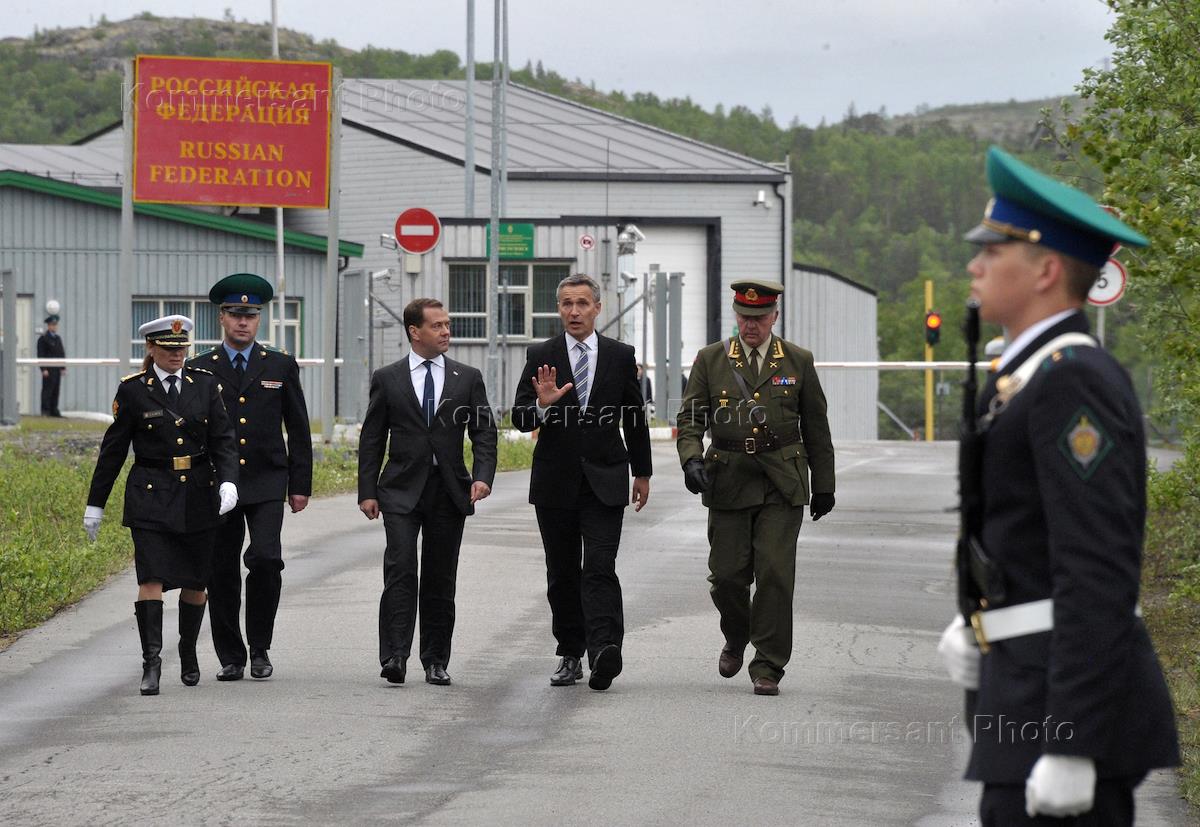 Премьер-министр Норвегии Йенс Столтенберг (слева) и председатель правительства России Дмитрий Медведев (в центре) на норвежско-российской границе, где осмотрели международный автомобильный пункт пропуска Стурскуг — Борисоглебск.