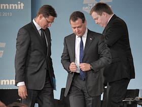 Встреча глав правительств стран-членов Совета Баренцева/Евроарктического региона (СБЕР) в норвежском Киркенесе. Премьер-министр Финляндии Юрки Катайнен, председатель правительства России Дмитрий Медведев и премьер-министр Исландии Сигмундур Давид Гуннлейгссон во время совместной пресс-конференции.
