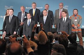 Встреча глав правительств стран-членов Совета Баренцева/Евроарктического региона (СБЕР) в норвежском Киркенесе. Слева направо: представитель Баренцева регионального молодежного совета (BRYC) от Республики Карелия, руководитель Международного молодежного клуба "Сольвейг" Анна Рыбалова, премьер-министр Исландии Сигмундур Давид Гуннлейгссон, министр иностранных дел Дании Вилли Севндаль, председатель правительства России Дмитрий Медведев, министр иностранных дел Швеции Карл Бильдт, премьер-министр Норвегии Йенс Столтенберг, вице-президент Европейской комиссии, комиссар по транспорту Сийм Каллас, шведский политик Свен-Эрик Остерберг, премьер-министр Финляндии Юрки Катайнен, президент шведского парламента Саами Ларс-Андерс Баер во время совместного фотографирования.