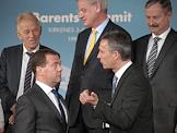 Встреча глав правительств стран-членов Совета Баренцева/Евроарктического региона (СБЕР) в норвежском Киркенесе. Слева направо: министр иностранных дел Дании Вилли Севндаль, председатель правительства России Дмитрий Медведев, министр иностранных дел Швеции Карл Бильдт, премьер-министр Норвегии Йенс Столтенберг, вице-президент Европейской комиссии, комиссар по транспорту Сийм Каллас во время совместного фотографирования.